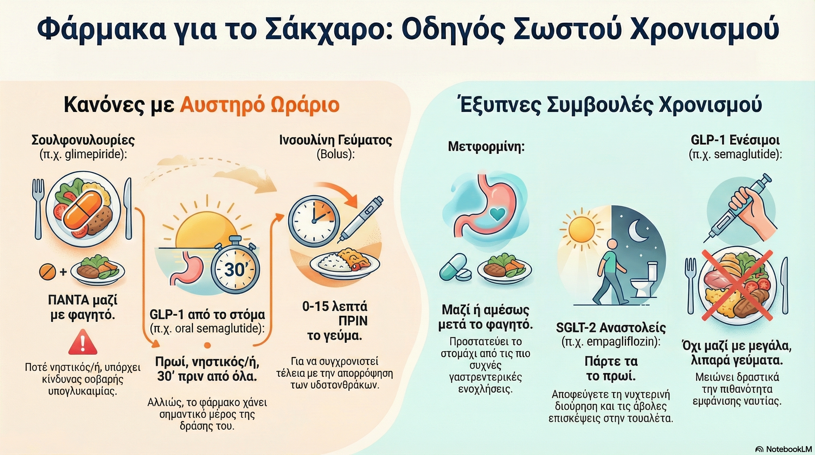 Φάρμακα που “σπρώχνουν” ινσουλίνη → με φαγητό Φάρμακα που “ρυθμίζουν” → ώρα ευκολίας Φάρμακα που “αδειάζουν” γλυκόζη → πρωί